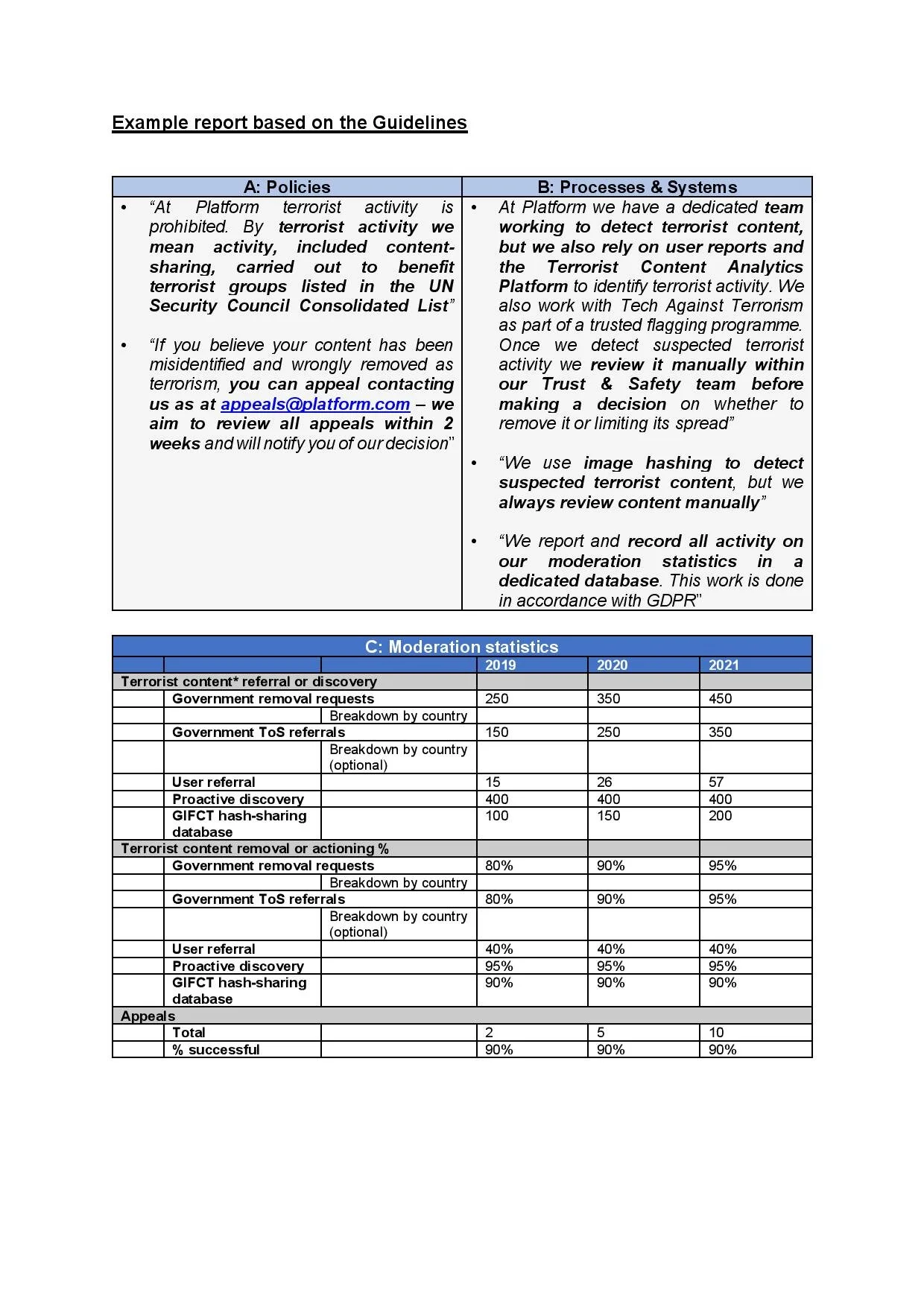 These Guidelines seek to improve transparency and accountability from governments and tech companies around online counterterrorism activities. The Guidelines serve as a starting point for increased transparency, and it is our aim that all governments and companies will report on the baseline set out in the Guidelines.