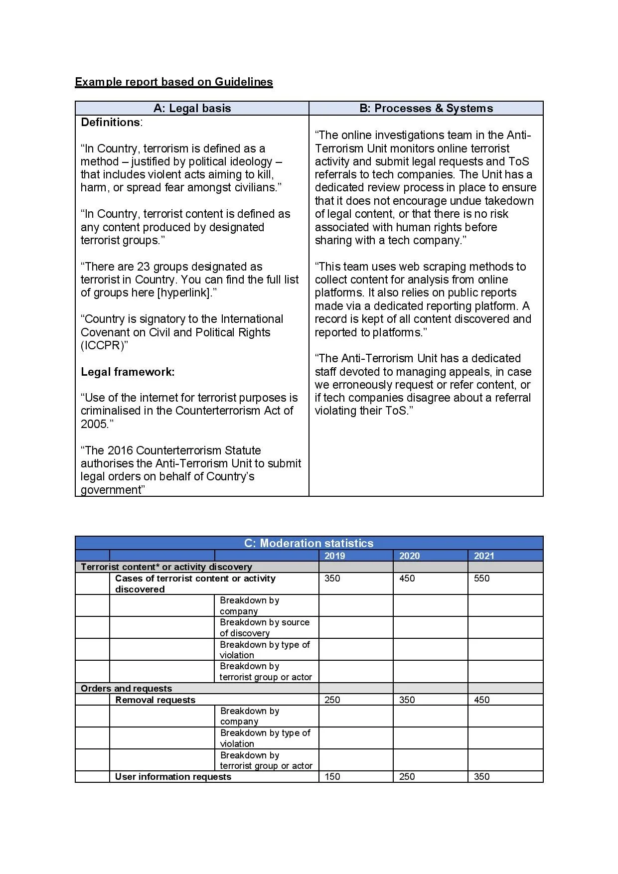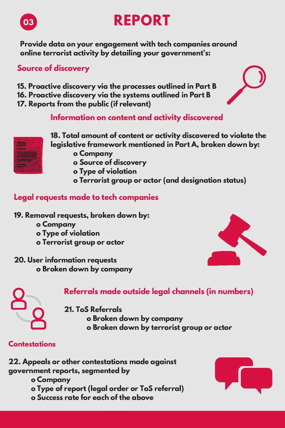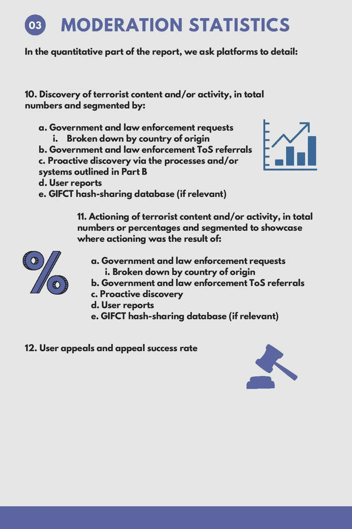 We also ask governments to detail the processes and systems they use to discover, report, and store terrorist content and activity, and what redress mechanisms they provide. Lastly, we ask governments to quantitatively report on their counterterrorism activities.